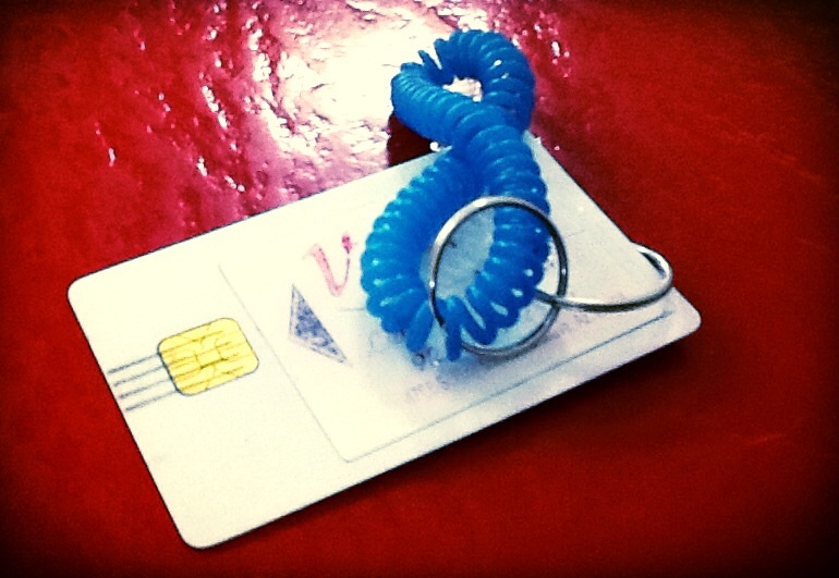 The laundromat leaves their key cards on the counter for you to select one. I usually pick yellow. Today there were only two, blue and green.