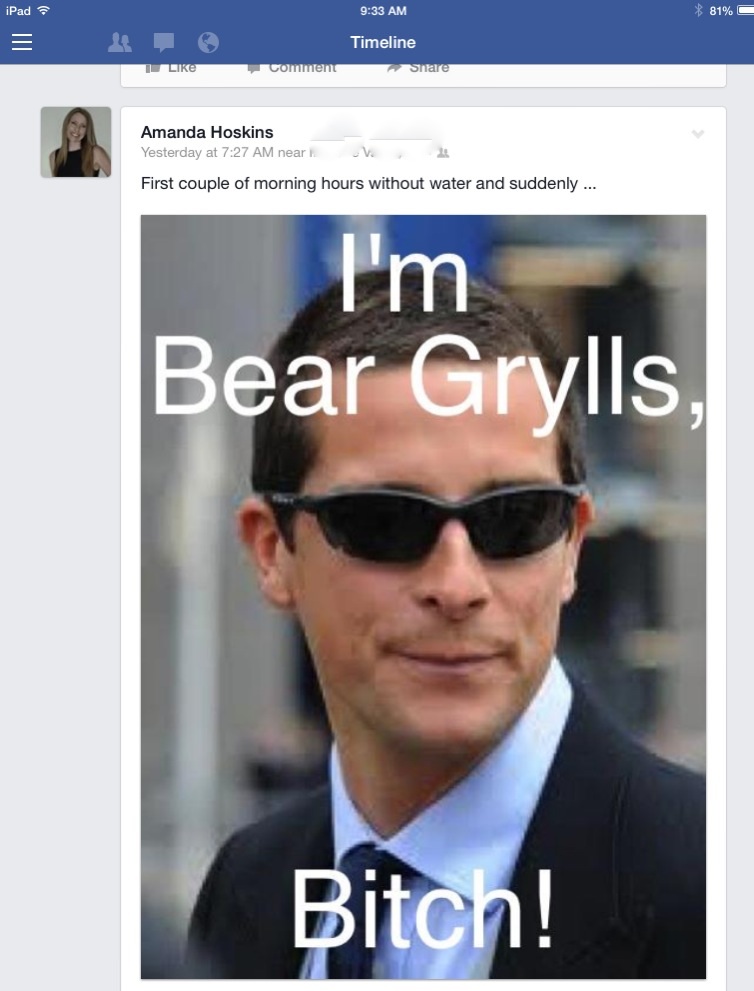Posted on September 7, 2014, in Humor, Uncategorized and tagged Bear Grylls, humor, turning water off, Water, water leak. Bookmark the permalink. 1 Comment.