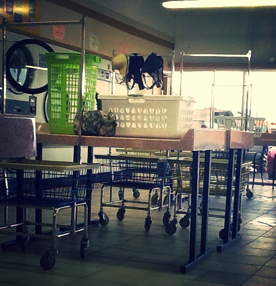 There are three bras slung over the rail of a laundry cart … just out there for all to see.  And no one is looking at them.  Untrue, can’t stop looking at them.  I keep glancing up.