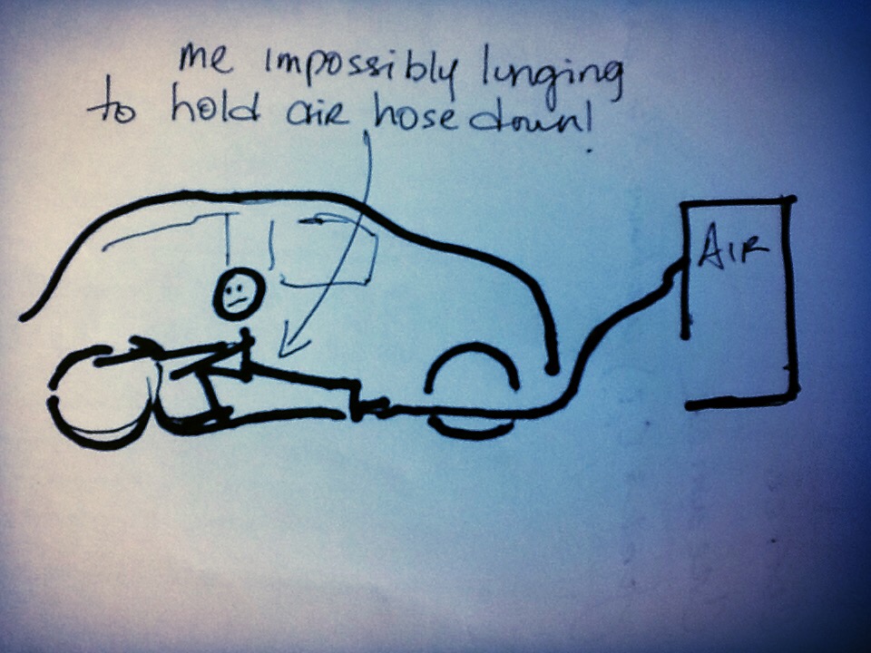 Ideally, leave your car sitting and do this at home, but I had to go to a gas station, not having an air pump at my disposal.