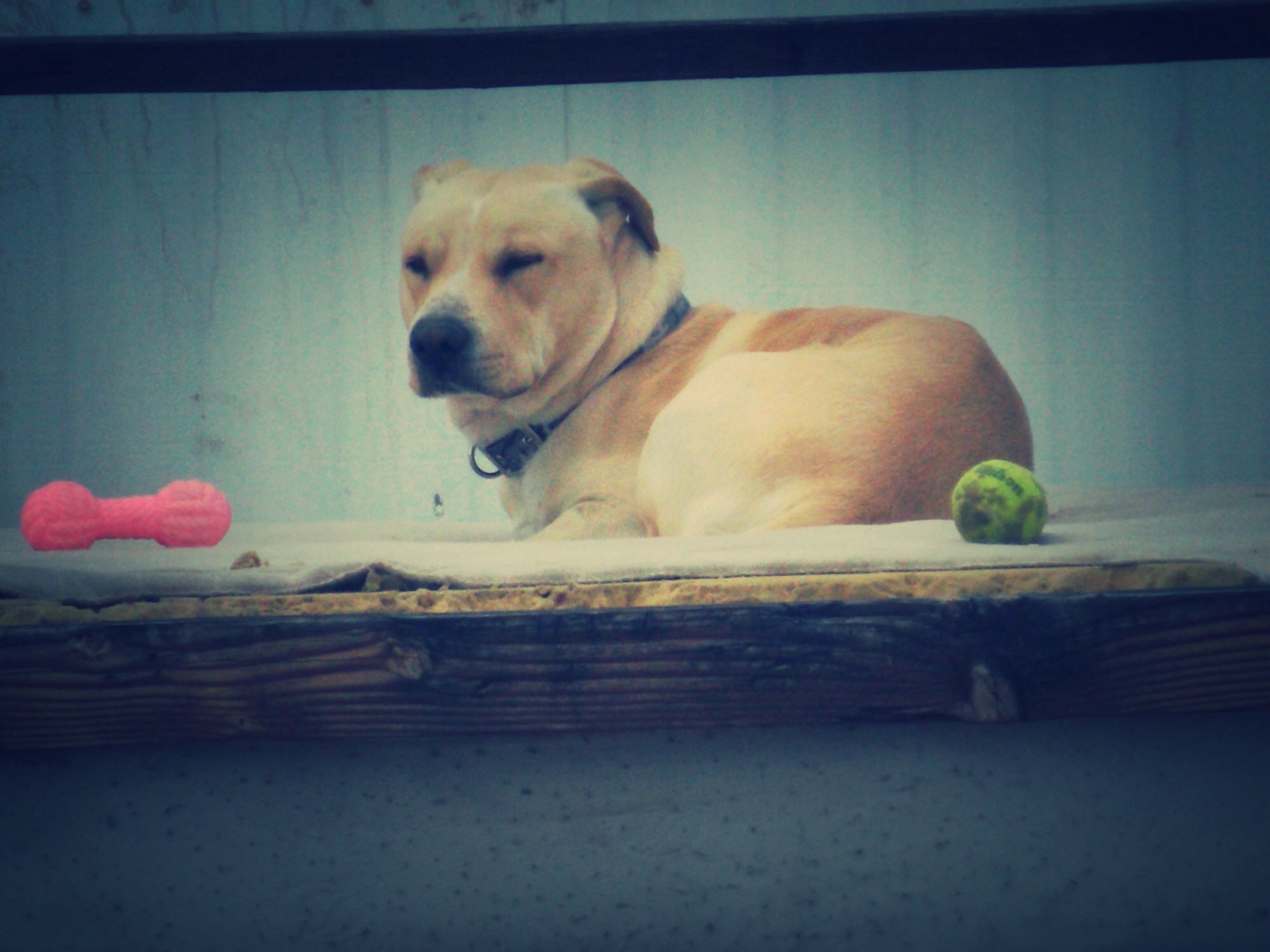 After playing with Butters, and the tennis ball retrieved in attempt to join in: