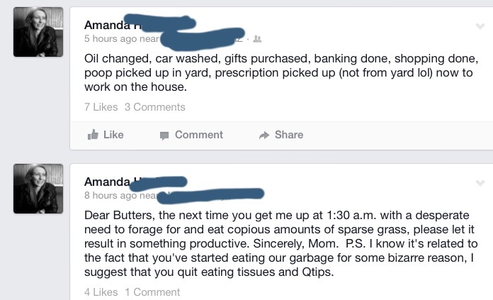 I started off with awaking at 1:00 a.m. with Butters staring at me. Urgently. Whining. We went outside and she chowed down on any grass she could find. Which, in a desert, is a pretty futile effort, but she knew every spot in our yard.