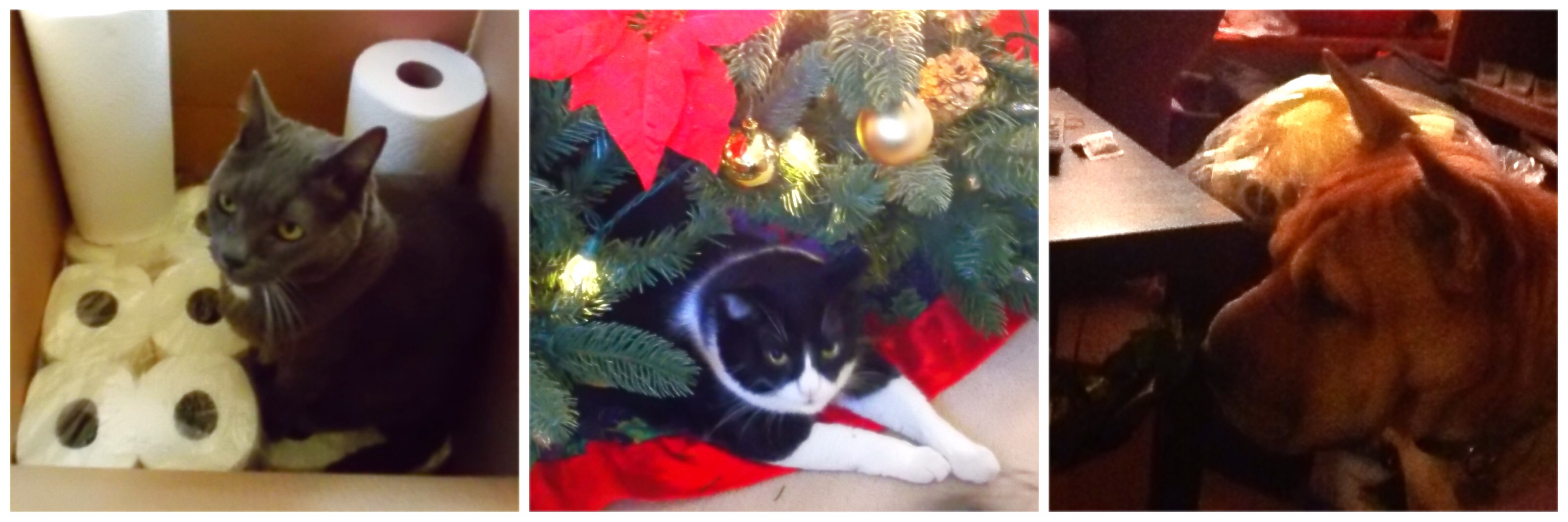 The animals … it was REALLY hard to get a good photo of Butters in the morning (at 5:30, when Nic came into my room with our stockings, it’s hard to get a good photo of anything). She was so wiggly and excited – all I got were blurry shots. I did however love these two photos of some of my moms pets – and the last one is the best photo I managed to get of ‘Christmas Butters’.