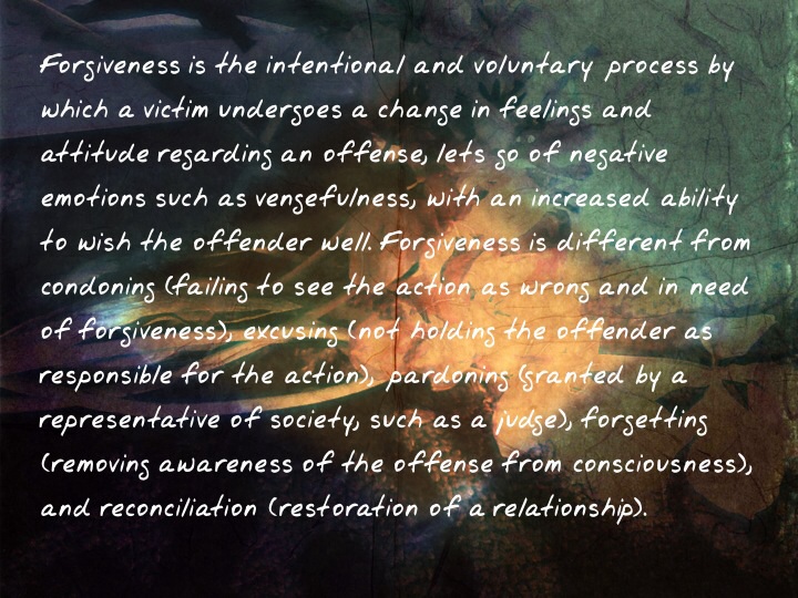 Not being a religious person, I can’t turn to theological definitions or procedure when it comes to forgiveness. I can be open to their ideas of course, many truths are universal and have a common thread in a variety of cultures and religious teachings.