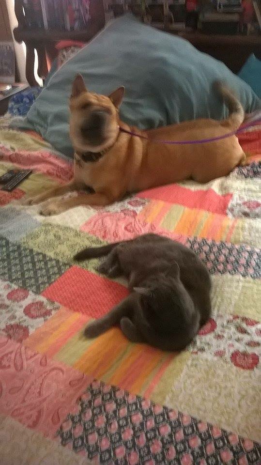 What we ARE still adjusting to, is the integration of my dog and his cat. It’s going well. But Butters (as Jim so appropriately described her) is like a bowling ball with legs.