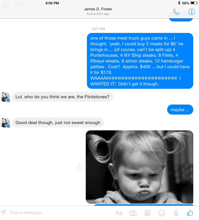 So it was odd that one of those ‘meat in a van’ people dropped by. No, not Schwans. You know the van … or truck … “I have one more packet of steak to sell, you can have it for five bucks!”
